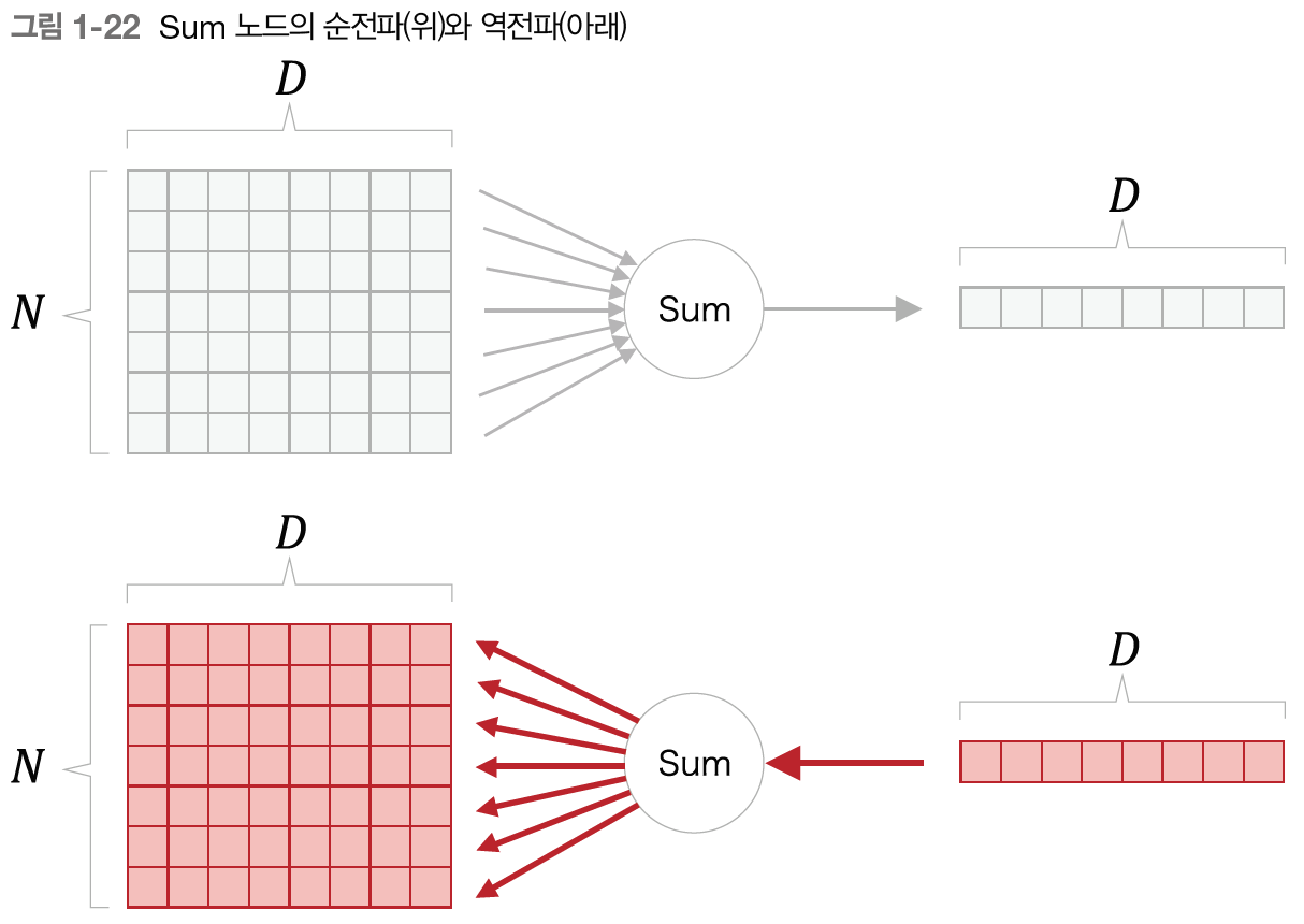 Sum노드의 순전파가 Repeat노드의 역전파가 되고, Sum노드의 역전파가 Repeat노드의 순전파가 된다.