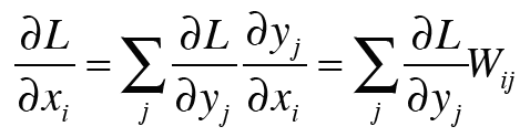 $$\frac{\partial{L}}{\partial{x_i}}=\sum_j \frac{\partial{L}}{\partial{y_j}}\frac{\partial{y_j}}{\partial{x_i}}$$
