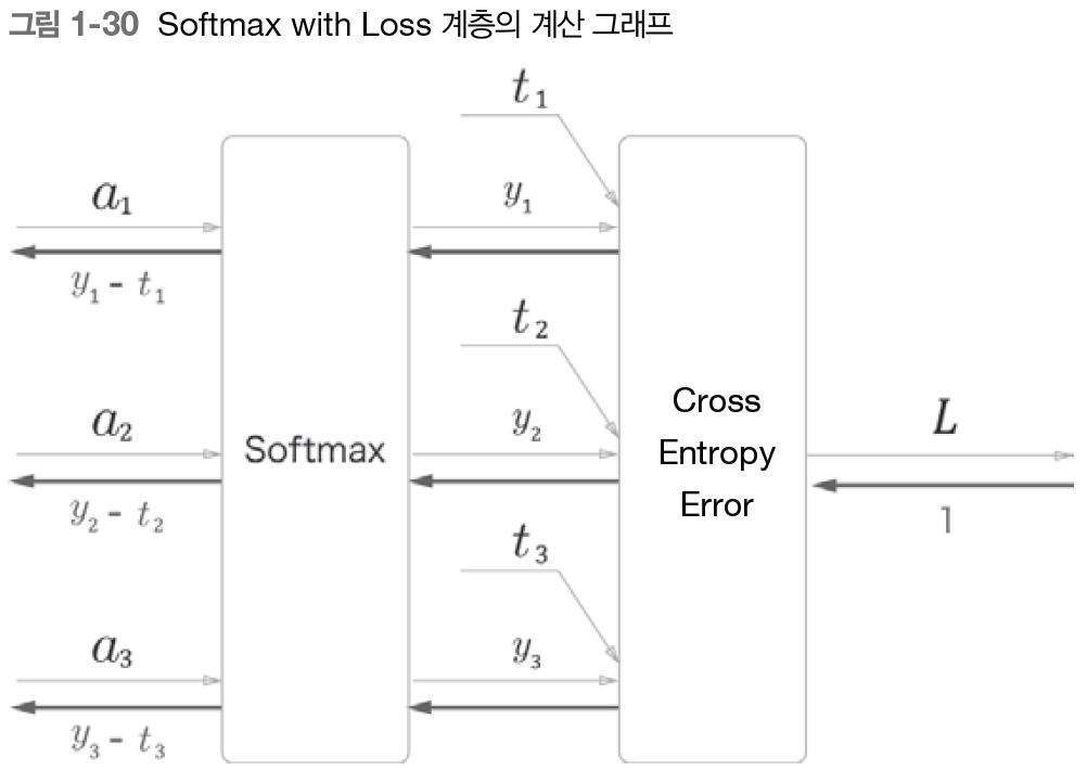이 책에서는 Softmax함수와 Cross Entropy Error를 계산하는 계층을 Softmax with Loss계층 하나로 구현한다.