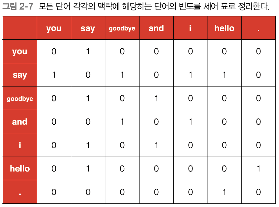 이 표의 각 행은 해당 단어를 표현한 벡터가 된다. 이 표가 행렬의 형태를 띤다는 뜻에서 동시발생 행렬(co-occurrence matrix)라고 한다.