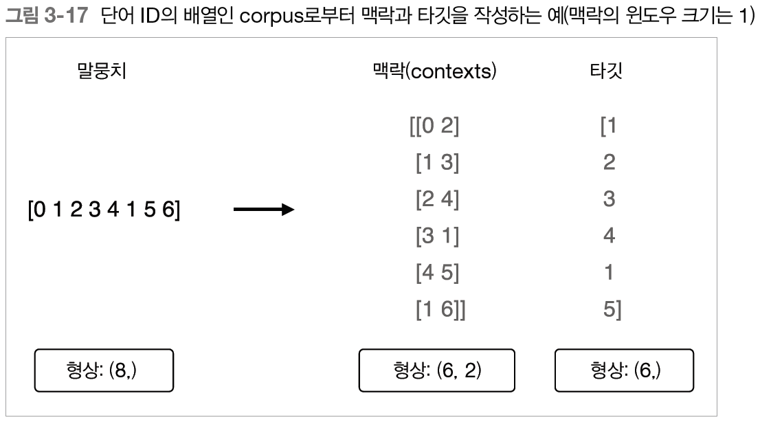 그런 다음 단어 ID의 배열인 corpus로부터 맥락과 타깃을 만들어낸다.